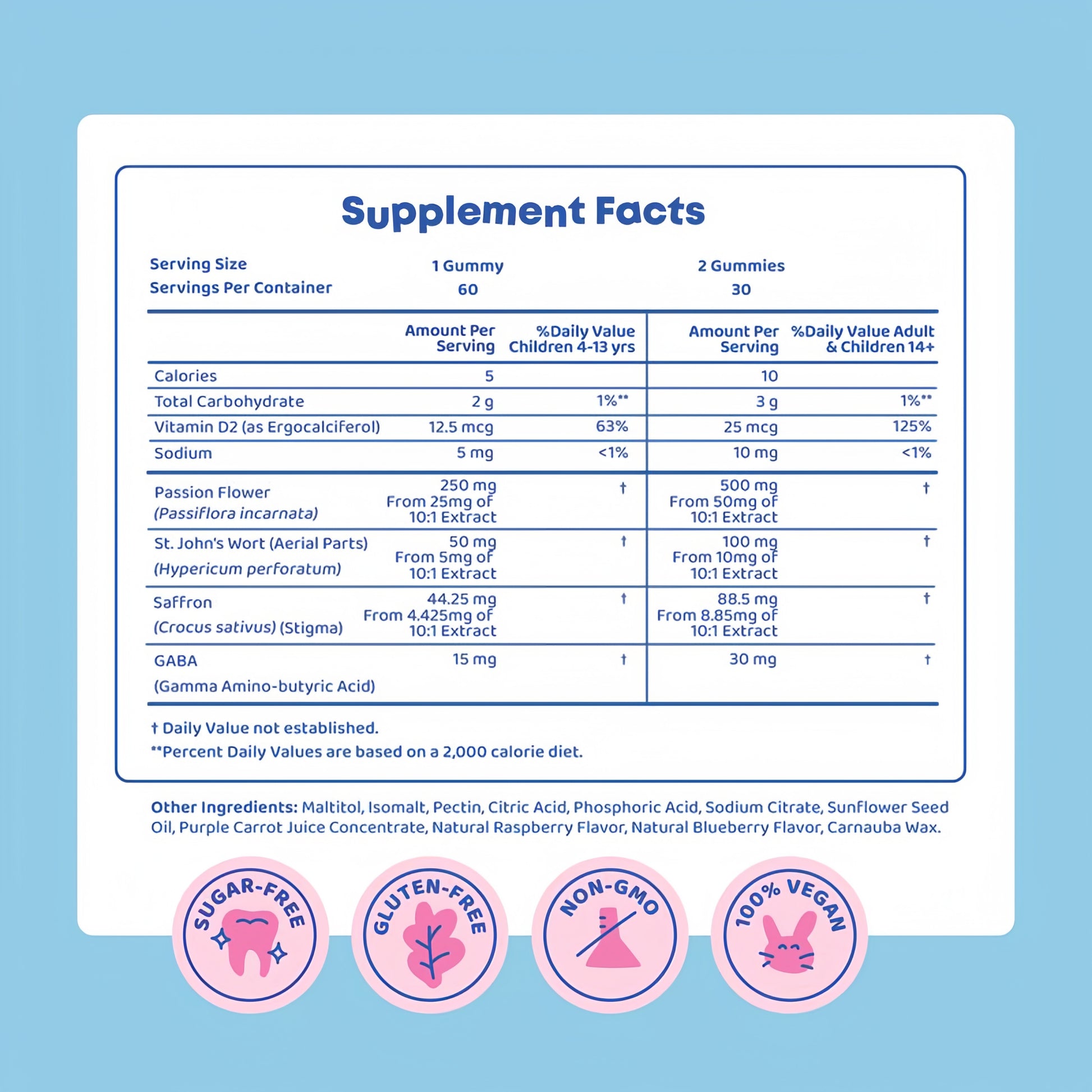 Formulated for children ages 4 and up. (Old enough to chew properly but still young enough to believe that gummy vitamins are a treat.) If your child has specific health conditions or takes medications—especially antidepressants, anxiety meds, or anything mood-related—check with your pediatrician first. St. John's Wort can interact with certain prescriptions, so better to ask now than deal with complications later.